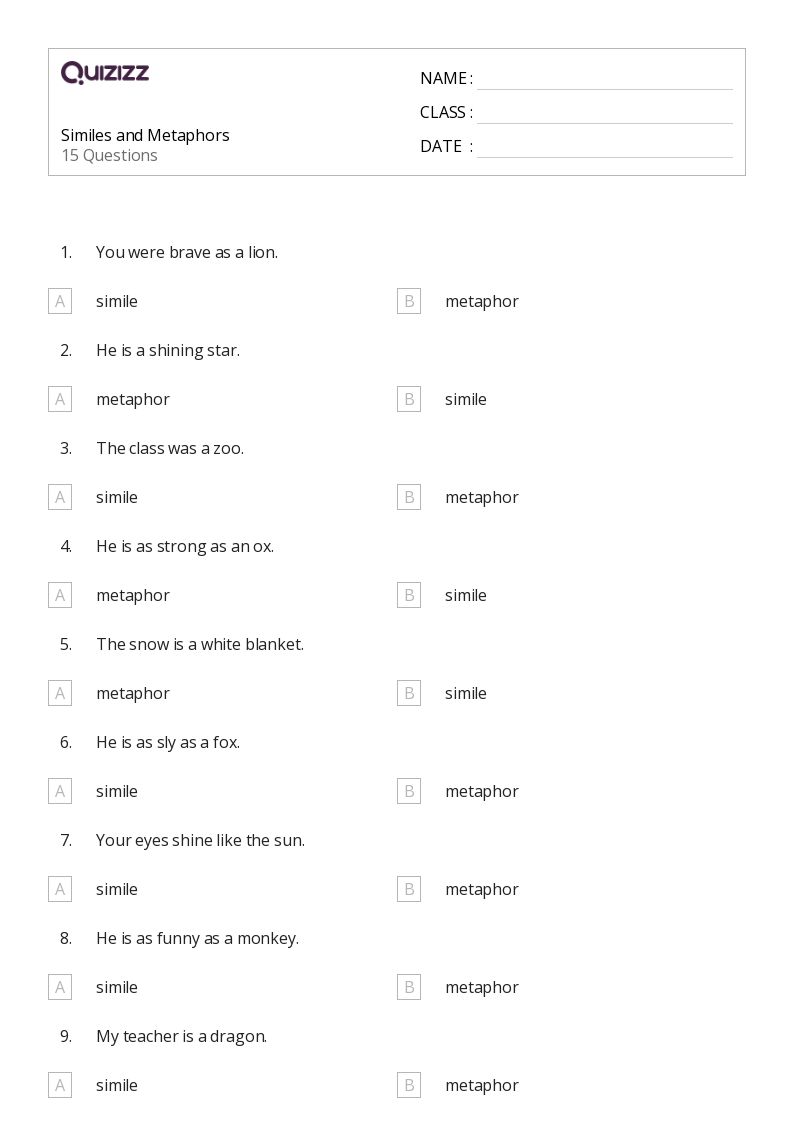 Our metaphors worksheets are free to download and easy to access in pdf format. These resources guide children through. Students will learn to identify and interpret similes, metaphors, and personification in writing. Click the checkbox for the options to print and add to assignments and collections.