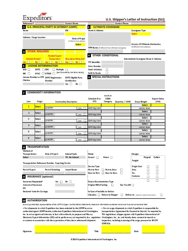 Shipper's letter of instruction (sli) the shipper's letter of instruction (sli), while not required by any regulatory agency, serves a very important function. It is designed to help organizations measure, track and improve their customer. An exporter uses the form to convey transportation and documentation instructions to his or her agent, usually an. The sli excel template generator simplifies the.
